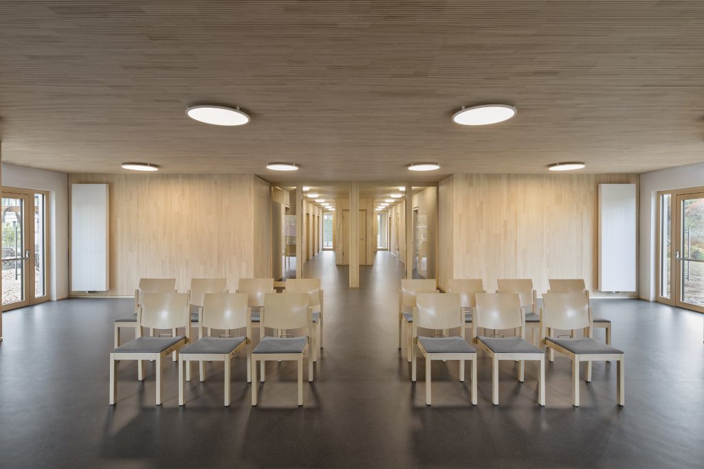 Als durchgreifende Wangen schieben sich die beiden neuen inneren Wandscheiben im Erdgeschoss des Gebäudes in das Foyer zum Eingang und führen gleichzeitig in die Tiefe bis zum Gemeindesaal. An deren Außenseiten lagern sich Verwaltung und andienende Funktionen an. In ihrer Materialität sind die Wangen in Anlehnung an die Fassade kontinuierlich als Weißtannenschalung geführt.