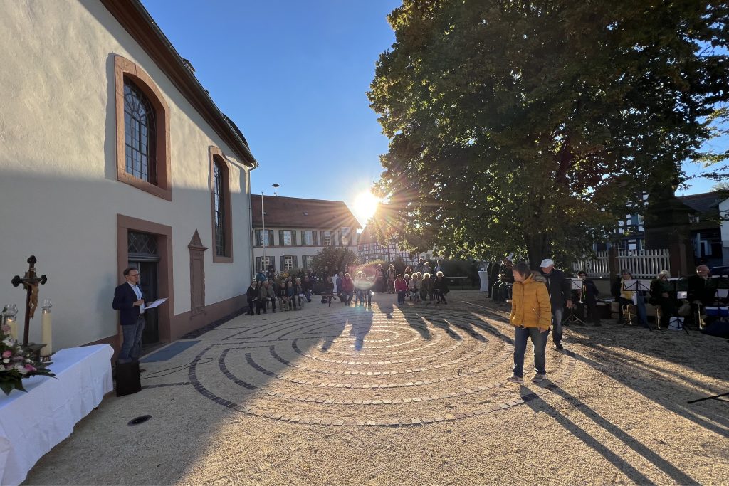 Durch die Neugestaltung des Kirchenvorplatzes mit seiner großen Dorflinde konnte die Aufenthaltsqualität durch Sitzgelegenheiten, Pflasterflächen, grünordnerischen Maßnahmen und dem neuangelegten Labyrinth deutlich erhöht werden.